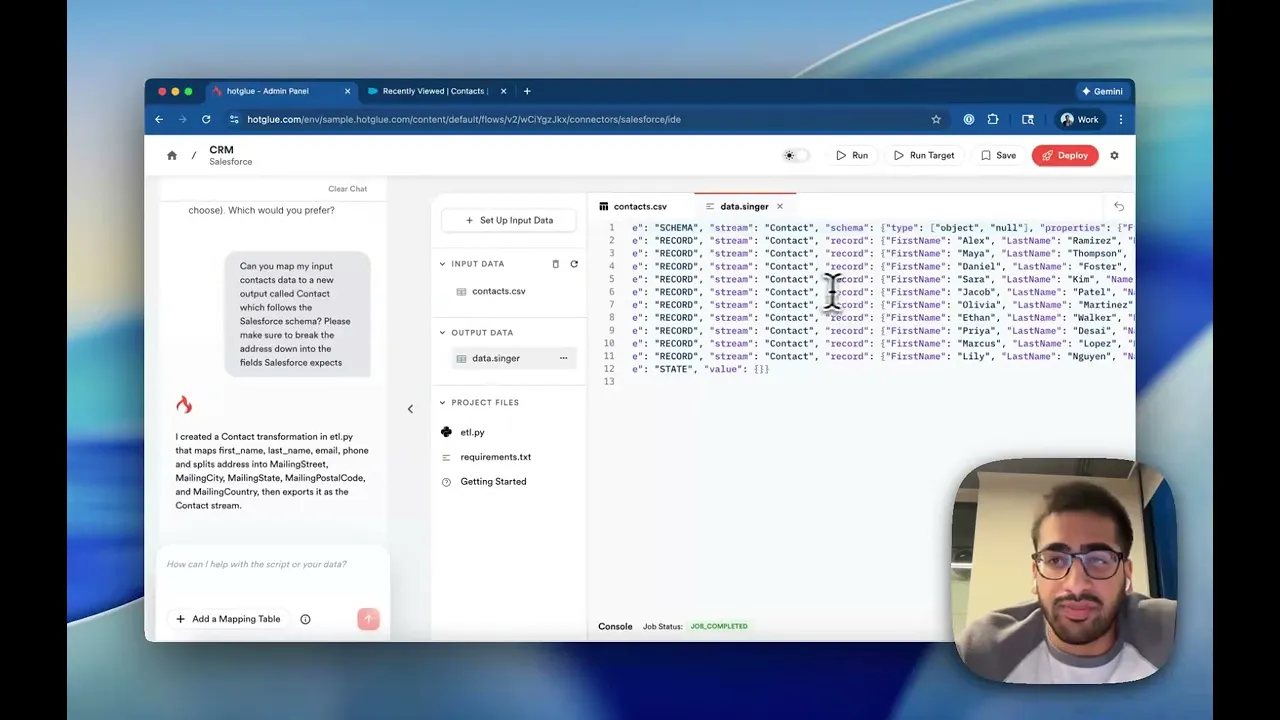 The output of Gluestick is a clean, production-ready Python script — meaning you can run it anywhere, or deploy it directly on Hotglue’s data movement infrastructure for scheduled ETL pipelines.